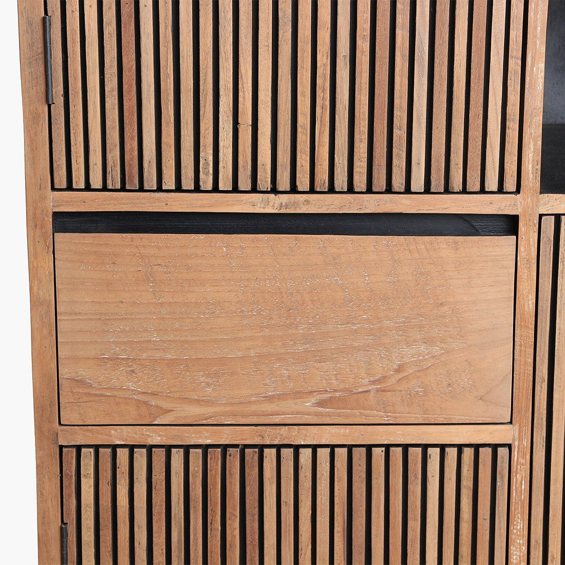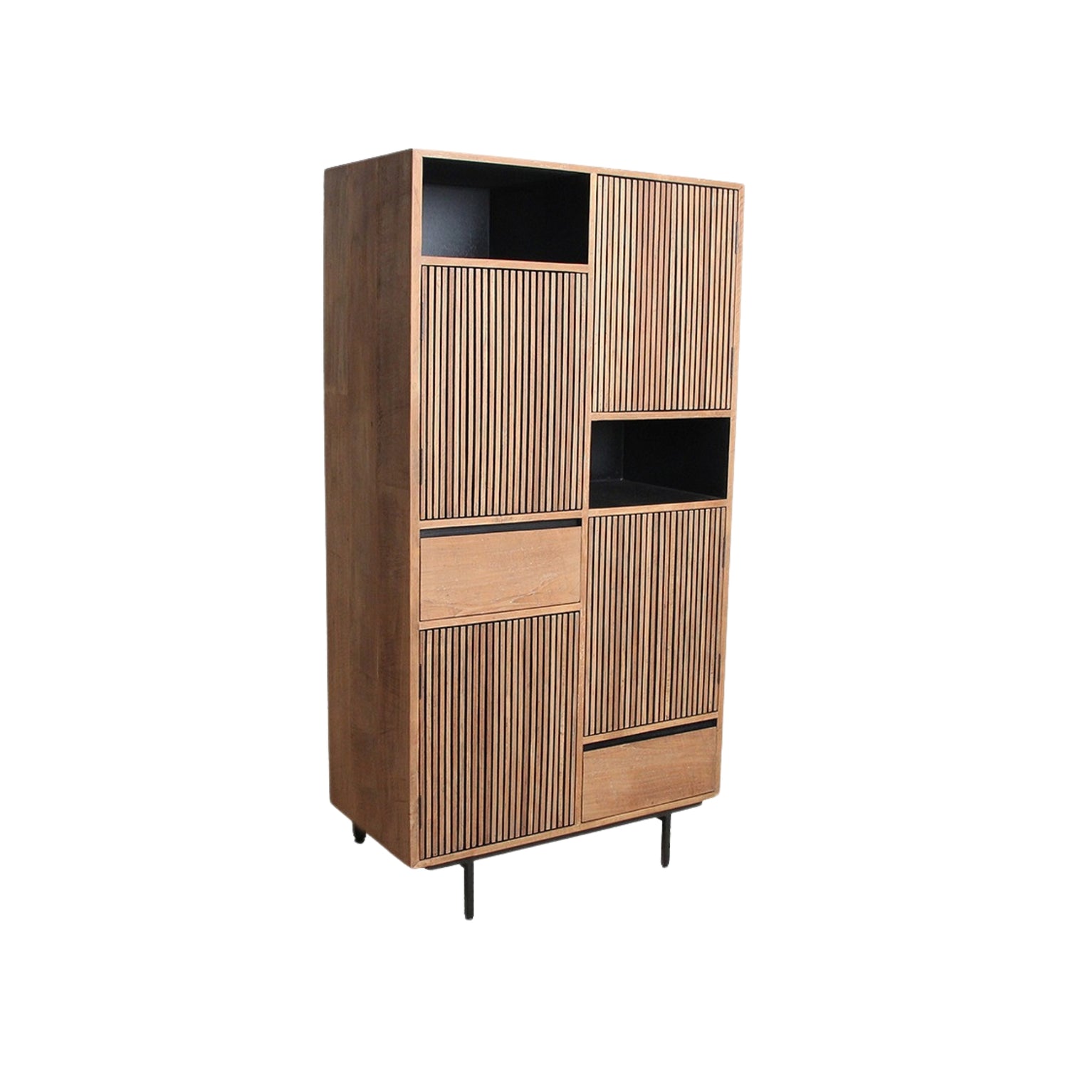 Strakke lijnen en warme houttinten maken de Rhythm cabinet tot een moderne eyecatcher. De zwarte details creëren een ritmisch effect, wat zorgt voor een tijdloze en elegante uitstraling. Met zowel open als afsluitbare compartimenten biedt deze kast voldoende opbergruimte voor al je spullen.