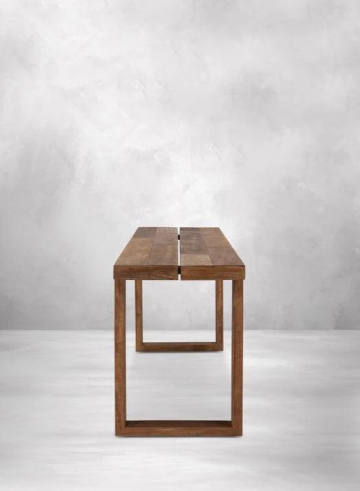 De U-vorm poten, eveneens gemaakt van gerecycled teakhout, lopen door tot halverwege de rand van het blad. Dit creëert een visueel effect waarbij het blad gedragen lijkt te worden – een kenmerkend detail van de Icon collectie.