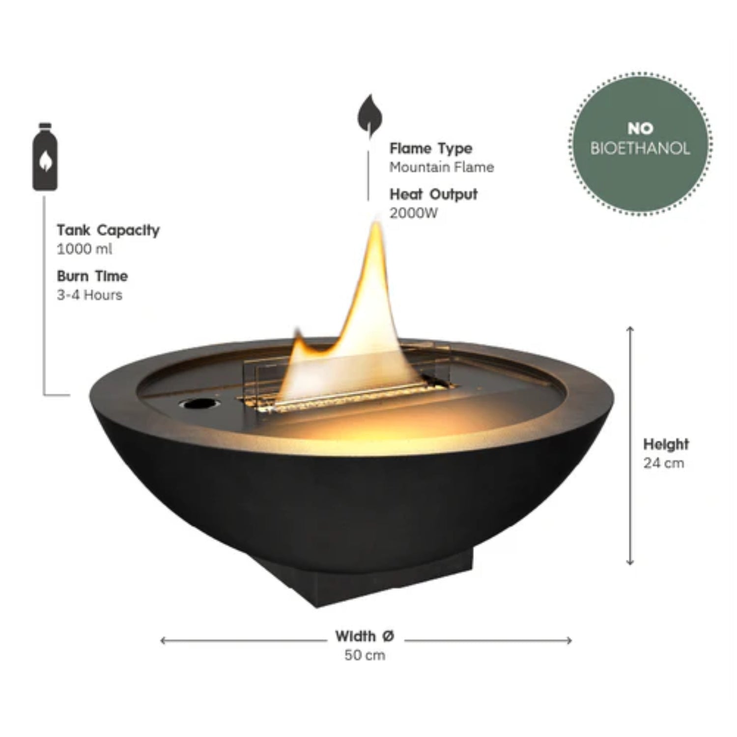 Met de Tenderflame Iris Beton tafelhaard haal je een combinatie van warmte, veiligheid en design in huis. Deze ronde haard heeft een robuuste uitstraling door het gebruik van MgO-materiaal en voegt direct sfeer toe aan jouw interieur of buitenruimte. Dankzij de 180 mm platte lont ontstaat er een indrukwekkende, bergvormige vlam die een natuurlijke en rustgevende ambiance creëert.