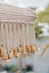 Bijzonder aan deze parasol is dat de franjes rondom gedecoreerd zijn met houten teak blokjes.