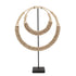 Deze opvallende decoratie op standaard verdient een mooi plekje in je huis. In de badkamer, slaapkamer of in de keuken. De twee cirkels zijn verfraaid met schelpen, been,  houten kralen en touw. Handgemaakt door Balinese ambachtslieden.