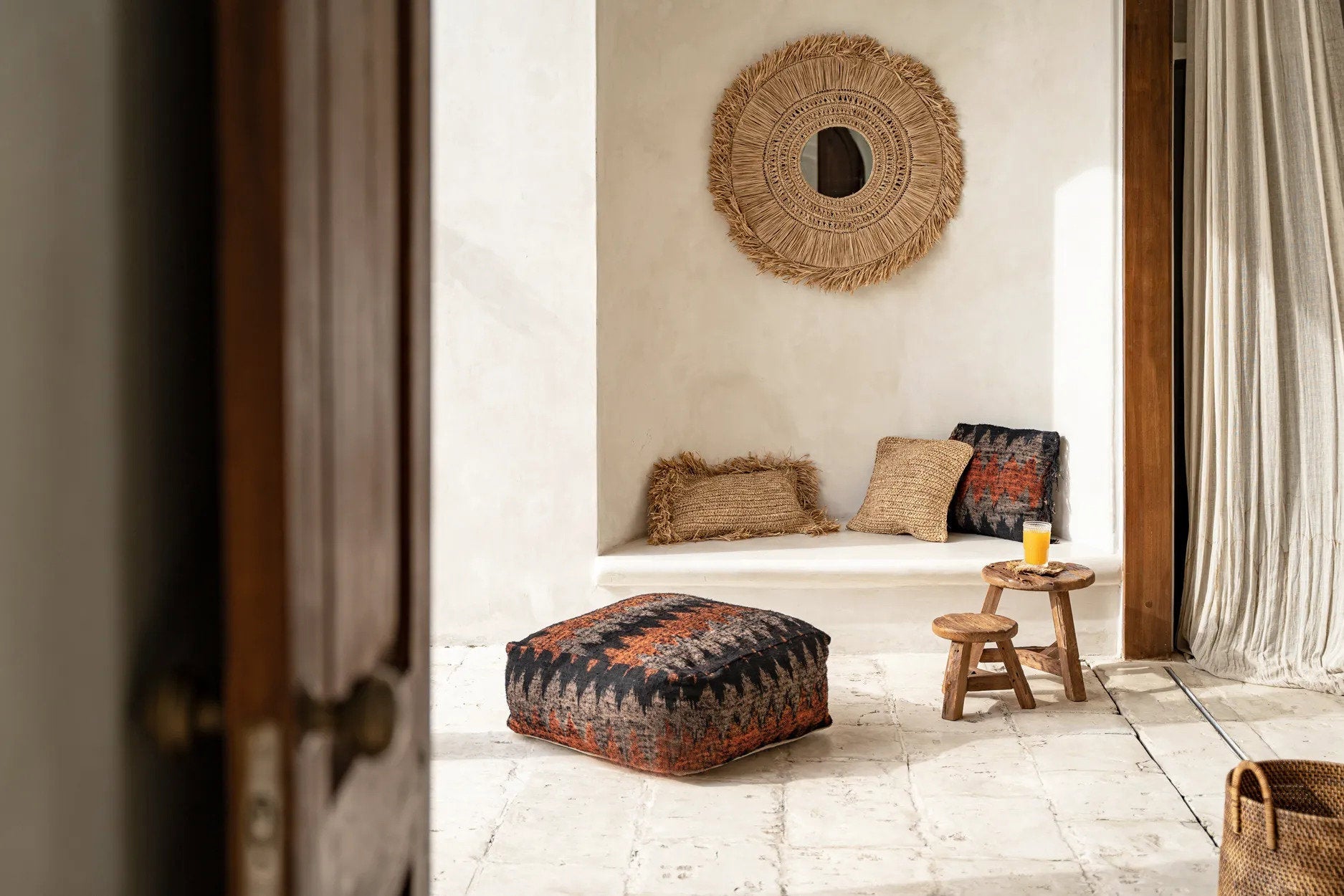 Het ontwerp van de Yuki spiegel is een verborgen schat; op het eerste gezicht eenvoudig, maar complexer naarmate je er langer naar kijkt. Vijf ringen van verschillende raffiaweefsels breiden zich naar buiten uit tot franjes die die typische kustsfeer uitstralen. De natuurlijke kleur van het materiaal past in elk interieur en in elke ruimte, maar we raden je aan om dit prachtige ontwerp een ereplaats te geven.