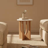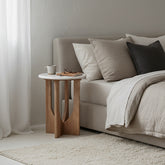 Het compacte formaat maakt de Kuching bijzettafel makkelijk te plaatsen in elke kamer. Het marmeren blad biedt ruimte voor een glas, een boek of een decoratief object, terwijl het lichte hout warmte en rust toevoegt aan je interieur.