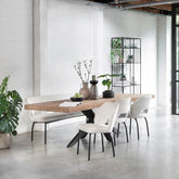 Het hout zorgt voor warmte en geeft het interieur een eigen karakter. De lichte kleuren van het hout geven de tafels een moderne uitstraling. Het metalen onderstel maakt de tafel compleet in zijn stoere uiterlijk. De collectie is eindeloos te combineren met elke woonstijl.