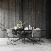 Ondanks de robuuste materialen zorgt de afgeronde vorm van het tafelblad voor een zachte uitstraling. Perfect voor wie op zoek is naar balans tussen stoer en verfijnd.