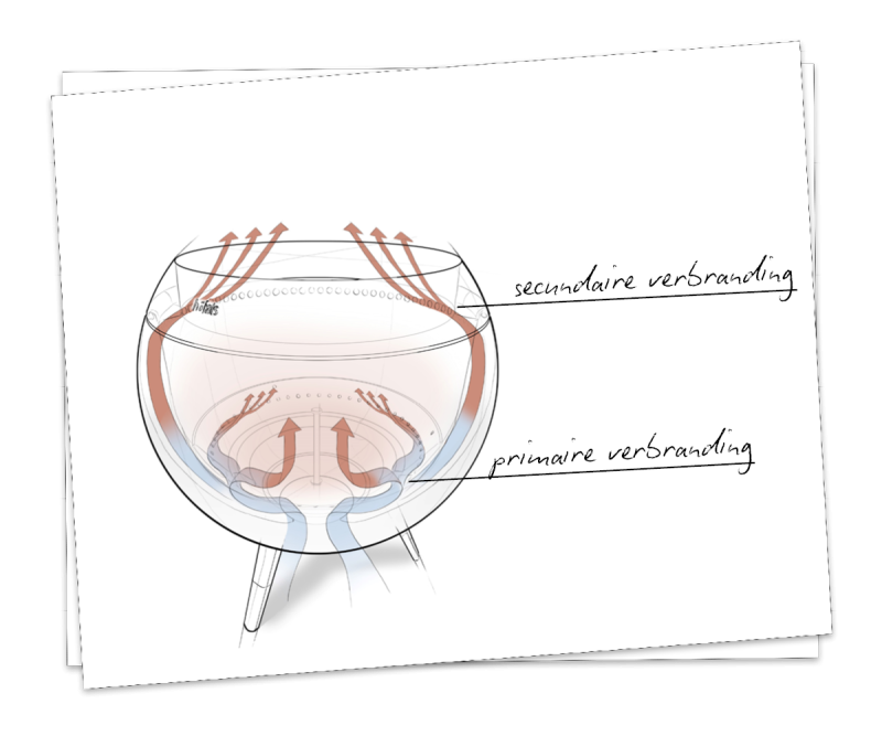 - Hier vindt een tweede verbrandingsfase plaats, waarin zelfs de kleinste houtdeeltjes efficiënt worden verbrand en vooral bij het gebruik van pellets een rookvrije vlam ontstaat.