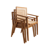 Het teakhouten onderstel zorgt voor een solide basis. De traditionele caning-techniek maakt de zitting stevig en tijdloos mooi. Bovendien zijn de stoelen stapelbaar, wat ze ideaal maakt als je meerdere exemplaren wilt opbergen.