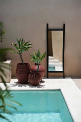 Spiegeltje, spiegeltje aan de wand wie is de mooiste van allemaal? Deze prachtige grote vloerspiegel is de perfecte metgezel voor je kleedkamer, slaapkamer of hal. Plaats tegen een muur of in de hoek van een kamer om een ​​extra ruimtelijk effect te creëren. Een prachtig en decoratief stuk dat een upgrade geeft aan elke blinde muur in je interieur. Elk stuk is uniek en handgemaakt met natuurlijke teaktakken, waardoor kleine verschillen in kleur en grootte mogelijk zijn.
