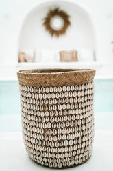 Deze mand gemaakt van de pandanplant en versierd met schelpen verzameld op de balinese stranden is een echte beauty. kijk eens naar de ongelofelijke details en liefde die in deze handgemaakte mand zijn gestoken - je zult hem voor altijd in je huis willen laten schitteren! gebruik hem om wasgoed of speelgoed op te bergen of zelfs voor een grote plant.