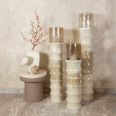 Geef je interieur een warme, sfeervolle uitstraling met de Kaylyne Cream enamel ribbed stormlight w glass S. Het geribbelde ontwerp en de crèmekleurige emaille afwerking geven dit windlicht een tijdloze, elegante uitstraling die past bij elk interieur.